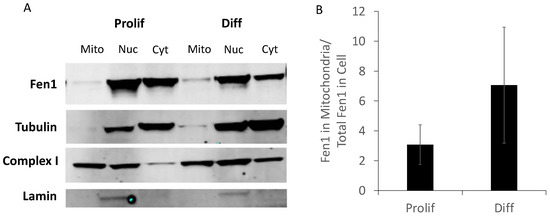 Expression of Fen1 in the mitochondria of differentiated cells. (A) Representative Western blots for mitochondrial cell extracts of Prolif and Diff cells. (B) Fen1 protein signal was normalized to that for Complex 1 as a loading control for mitochondria, with laminin as a marker for the nucleus. Mitochondrial Fen1 levels were divided by whole-cell Fen1 levels to calculate mitochondrial Fen1 per cell. Error bars indicate the standard deviation (n = 3).