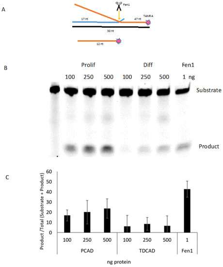 Flap excision activity in proliferating and differentiated CAD cells. (A) Substrate for the flap endonuclease assay. The double-flap structure is optimal for Fen1 [27]; the target strand for that enzyme is labeled on its 5′ end the TAMRA fluor. The expected Fen1 product is shown. (B) Representative gel for the flap excision assay using whole-cell extracts from Prolif and Diff cells. Increasing amounts of extract were used for 1 pmol of substrate; Fen1 (51 nmol) was used as a positive control. The incubation was performed at 37 °C for 30 min. (C) Quantification using Image J (version 2.0.0-rc-68/1.52i) (n = 3).