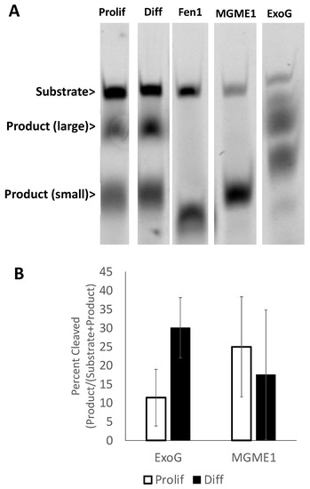 Mitochondrial flap excision activity in proliferating and differentiated CAD cells. (A) Lanes from a single representative gel of the flap excision activity using mitochondrial extracts from proliferating (Prolif) and differentiated (Diff) CAD cells. The flap substrate (1 pmol) was incubated at 37 °C for 15 min with 2.7 μg of mitochondrial extract, or 0.5 pmol of Fen1 or MGME1, or 5 pmol of ExoG. The products were resolved by electrophoresis in urea/formamide gels. The original gel is shown in Figure S4. (B) ImageJ quantification of cleavage products (n = 5), with the slower mobility (large) product taken to indicate ExoG activity and the higher mobility (“small”) taken to indicate MGME1 activity.