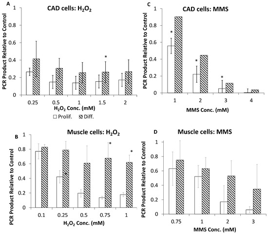 Mitochondrial DNA damage generated by hydrogen peroxide or MMS. (A,C) CAD cells were treated for 30 min with the indicated concentrations of H2O2 or MMS. (B,D) Mouse muscle cells treated as in A and C but for 60 min. Immediately after the treatment, genomic DNA was isolated for PCR analysis. The values for treated cells are reported relative to those for untreated cells, and the result for the controls was set to 1. The error bars indicate standard deviation (n = 3), and * denotes p < 0.05 between the results for proliferating and differentiated cell mtDNA as measured by Student’s t test.