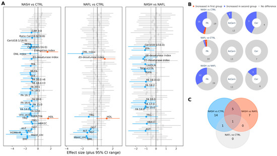Effect size analysis of the differences among the study groups. (A) Effect size plots of all the parameters studied: The calculated effect size of each variable is depicted along with the corresponding 95% CI. Variables that had an effect size value beyond the +/− 0.5 limit (gray dashed vertical lines) and simultaneously present a statistically significant difference with a Mann–Whitney U test p value < 0.05 are colored red and blue, respectively. (B) Pie chart with a comparison of the number of plasma lipid species (total fatty acids (FA), acylcarnitines (AcCarn), and ceramides (Cer)) that showed significant changes among the 3 groups: For each pair of groups compared, we have a record of the category of the plasma lipids compared. The criteria for a significant change and the color code are the same as those in Figure 1A. (C) Venn diagram showing the number of common significantly differentiated lipid species in the paired comparisons of the three groups of subjects: The common lipids for the NASH vs. NAFLD and NASH vs. control pairs are FA 14:0, 15:0, 18:0, 18:3n3, Δ5-desaturase index, and Cer(d18:1/16:0) μmol/L.