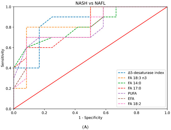 We calculated the area under the curve (AUC) to assess the ability of different parameters in discriminating NASH from NAFL/healthy controls. The index of Δ5-desaturase had an AUC of 0.854 (0.64–0.99), FA 18:3 n3 (ALA) had an AUC of 0.85 (0.69–0.99), and FA 14:0, FA 17:0, PUFA, EFA, and FA 18:2 had AUC values greater than 0.8. AST values had an AUC of 0.825 (0.63–0.99).