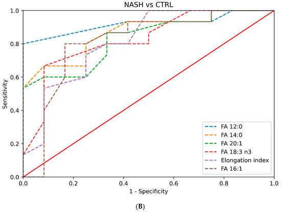 When we assessed the ability of plasma lipid parameters to discriminate between NASH and healthy controls, FA 12:0 had an AUC value of 0.92 (0.81–1); FA 14:0 had an AUC value of 0.87 (0.71–0.98); and FA 20:1, FA 18:3 n3, the elongation index, and FA 16:1 had AUC values greater than 0.8. The AUC values of the plasma lipids with an AUC > 0.8 for each pair of groups compared are presented in Table 6 and Figure 2. The AUC values for all the plasma lipids are presented in Supplementary Table S5.