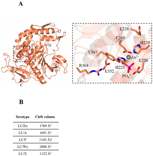 BoNT-like (BoNT homologue) light chain from Enterococcus faecium. (A) Crystal structure of BoNT-like light chain (LC) from Enterococcus faecium. The inset highlights the catalytic residues of LC/En, which are conserved across BoNT serotypes. (B) cleft volume sizes across BoNT serotypes/En/A,/F,/Wo, and/X were calculated with a 3 Å probe size using the 3 V cavity, channel, and cleft volume calculator [44]. The following PDB coordinates were used: LC/En (present structure), LC/A (2IMC), LC/F (2A97), LC/Wo (6RIM), and LC/X (6F47).