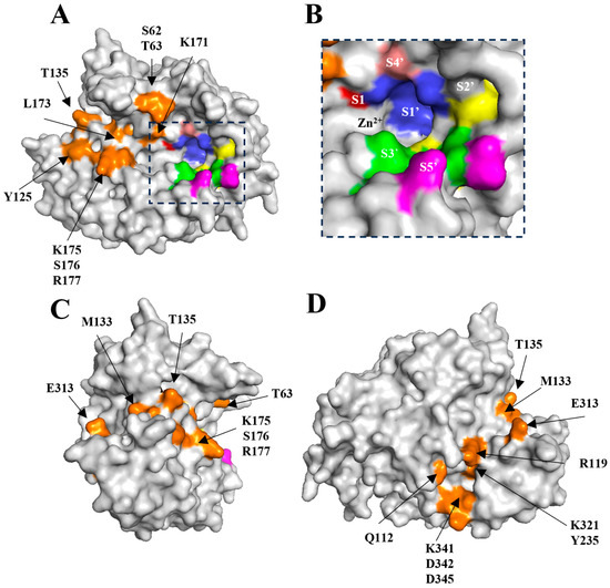 Location of putative subsites and exosites of LC/En. (A) Surface representation of LC/En with subsites and exosites highlighted. (B) Putative LC/En subsites. (C) Vertical 90° rotation of (A). (D) Vertical 180° rotation of (A). The putative subsites are coloured red (S1), blue, (S1′) yellow (S2′), green (S3′), pink (S4′) and magenta (S5′). The putative exosites are coloured orange and extend throughout the entire cleft.