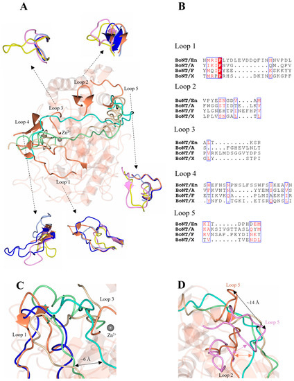 Additionally, we have identified a total of five loops (designated as loops 1–5) (Figure 4) that have been associated with substrate and belt recognition in the LC/En, LC/A:SNAP-25, and LC/F:VAMP2 structures. Relative to the scissile bond, LC/A loops 1, 2, 3 and 5 bind the N-terminal portion of SNAP-25, whereas loop 4 forms both the S3′ and S5′ subsite to recognise the C-terminal portion [47]. These loops vary in both length (Table 4) and conformation (Figure 4A) across the serotypes accounting for variation in substrate binding. Given the proximity of the VAMP cleavage sites for LC/En and LC/X, their substrate recognition sites are likely to be spatially similar. The scissile bond of VAMP2 for LC/F is nine residues away from the scissile bond for LC/En, indicating that the subsites will vary, and previously loops 1, 2 and 3 were identified as exosites for VAMP binding in LC/F [50].