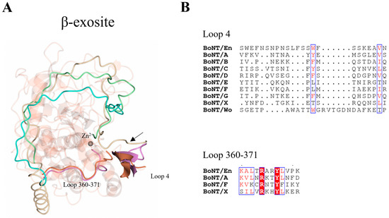 Loops 1 and 4 are significantly longer in LC/En compared to LC/A, LC/F, and LC/X (Table 4). The additional portion of loop 1 contains several charged residues whereas loop 4 is predominantly hydrophilic (Figure 4B), and the increased length of both loops may contribute to the substrate promiscuity observed for LC/En. Superimposition of LC/En with the LC/A:SNAP-25 and LC/F:VAMP2 structures reveal that SNAP-25 and VAMP2 would sterically clash with loop 1 in LC/En (Figure 4C) and that the heavy-chain belt is positioned ~6 Å away from both SNAP-25 and the VAMP2. However, in the full-length BoNT/En AlphaFold2-predicted structure, loop 1 adopts a wider conformation that extends to form an interaction with the heavy-chain belt (Figure 4C). This suggests a difference in substrate positioning involving loop 1 compared to LC/A and LC/F and provides some insight into potential dynamics unique to LC/En due to its increased length. In LC/A, loop 4 is five residues shorter (Table 4) and along with loop 360–371 is referred to as the β-exosite (Figure 5). This exosite contributes to the formation of the S3′ and S5′ subsites (Table 2, Figure 3A,B), which are essential for binding SNAP-25 at its C-terminal end [48,51]. Loop 4 has been shown to alter conformation upon substrate binding, and its importance was recently highlighted in a study that probed the protease activity using single-domain antibodies. The antibodies target the S1′-S5′ subsites (including loop 4) and adopt a similar conformation to that of SNAP-25 at this site [52]. It is, therefore, probable that loop 4 serves a similar function in LC/En, stabilising the P’ end of SNAP-25 and VAMP, due to its location relative to the active site zinc ion (Figure 5A). Interestingly, LC/Wo also has a comparably long loop 4 structure containing one additional residue (compared to LC/En) (Figure 5B) and has been suggested to possess wider substrate specificity [43].