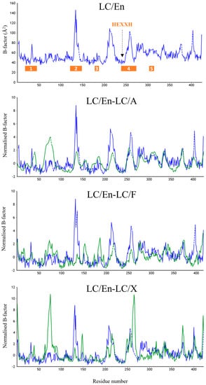 B-factor analysis of LC/En, LC/A, LC/F, and LC/X. Raw B-factor analysis of LC/En, and normalised B-factor comparison of LC/En-LC/A, LC/En-LC/F, and LC/En-LC/X. The analysis was performed using the web tool ‘BANΔIT’ [53]. For each normalised B-factor comparison plot, LC/En is shown in blue, and LC/A, LC/F, and LC/X are shown in green. Loops 1–5 are shown by the orange bar in the raw B-factor plot of LC/En.
