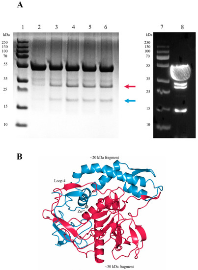 Autoproteolytic cleavage of LC/En. (A) SDS-PAGE (lanes 1–6) and Western blot (lanes 7–8) analysis of LC/En. SDS-PAGE was performed after incubation at room temperature for 1 hour (lane 2), 3 days (lane 3), 4 days with subjection to heat stress, (lane 4) 4 days (lane 5), and 4 days with subjection to freeze–thaw (lane 6) following size exclusion. Western blot was performed on LC/En that was concentrated to 6 mg/mL for preliminary crystallisation trials (lane 8). PageRuler Plus protein ladder is shown in lanes 1 and 7. The red arrow indicates the ~30 kDa fragment, and the blue arrow indicates the ~20 kDa fragment, and only N-terminal fragments are visible by Western blot analysis, indicating the presence of the 30 kDa fragment, along with the intact 50 kDa LC/En and further LC/En fragments at ~34 kDa and ~15 kDa indicative of other degradation/cleavage sites. (B) LC/En colour coded to represent the ~30 kDa (red) and ~20 kDa (blue) fragments that would arise from autoproteolytic cleavage at loop 4, which is consistent with the autoproteolytic cleavage site observed in LC/A, LC/B, and LC/E.
