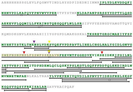 A total of 100 µL of LC/En (at ~3 mg/mL) was used for trypsin digestion. An amount of 200 µL of 10 mM DTT in 50 mM ambic pH 8.4, was added to the sample and incubated at 56 °C for 30 min. The sample was left to cool at room temperature before addition of 200 µL of 55 mM iodacetic acid in 50 mM ambic pH 8.4 and incubated in the dark for 30 min. Then, 20 µL of trypsin (25 ng of trypsin in 50 mM ambic pH 8.5) was added at room temperature for 15 min, followed by further incubation at 37 °C overnight. The following day, 50 µL of 0.1% trifluoroacetic acid was added, followed by a further 50 µL after 10 min. The sample was then dried using the SpeedVac vacuum to a final volume of ~20 µL prior to ESI-MS analysis. The Agilent QTOF 6545 with Jetstream ESI spray source coupled to an Agilent 1260 Infinity II Quat pump HPLC with 1260 autosampler, column oven compartment, and variable wavelength detector (VWD) was used for ESI-MS of trypsin-digested LC/En. Positive ionisation mode was used with a gas temperature of 325 °C, the drying gas at 13 L/min, and the nebulizer gas at 35 psi (2.41 bar) in the 100–2000 m/z ranges collecting 5 spectra/sec. The sheath gas temperature was set to 300 °C and flow to 12 L/min. For MS/MS, the mass ranges were 50–2000 m/z collecting 3 spectra/sec with an isolation width set to medium (4 amu). Ions with charge states of 2, 3, or more were selected for fragmentation. For 2+, the slope was 3.1 with an offset of 1, 3+ the slope was 3.6 with an offset of −4.8, and for more than 3 the slope was 3.6 with an offset of −4.8. Ten precursors were selected per cycle, actively excluded after 3 spectra for 0.2 min. The MS was calibrated using a reference calibrant introduced from the independent ESI reference sprayer. Chromatographic separation was performed on a Water Acquity BEH C18 2.1 × 50 mm, 1.7 µm using H20 (Merck, LC-MS grade) with 0.1% formic acid (FA, Fluka) v/v and acetonitrile (ACN, VWR, HiPerSolv) with 0.1% FA v/v as mobile phase A and B, respectively. The column had a total run time of 12 min, where the flow rate was set at 0.3 mL/min at 50 °C, starting with 1% mobile phase B for 0.5 min; afterwards, the gradient was set to 5 min at 40% B, then 100% B at 7 min, and then held at 100% B for 2 min before being returned to 1% B at 9.1 min. The VWD was set to collect 280 and 320 nm wavelengths at 2.5 Hz. Finally, 10 µL injections of the samples were made [68]. Data processing was automated in BioConfirm v 10 (Build 10.01.10136).