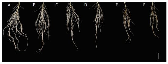 Influences of various concentrations of Mn on soybean root morphology. Root phenotypes of soybean with different Mn concentrations (from left to right: (A–F): 5, 50, 100, 150, 200, and 300 µM) after 15 days of treatment (bar = 3 cm).