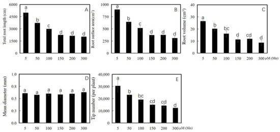 Results of various concentrations of Mn on growth of soybean root. (A) Total root length; (B) root area index; (C) root volume; (D) root mean diameter; and (E) root tips number. The data were represented by the mean value and standard deviation (n = 4). Duncan’s multiple comparison test was adopted for significant analysis of the differences in root growth between the normal group and the treatment group, and different letters on the bar chart indicated significant differences (p < 0.05).