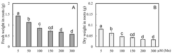 Results of various Mn concentrations on root weight of soybean. (A) Fresh and (B) dry weights of roots. The data are represented by the mean value and standard deviation (n = 4). Duncan’s multiple comparison test was adopted for significance analysis of the differences in root growth between the normal group and the treatment group, and different letters on the bar chart indicate significant differences (p < 0.05).