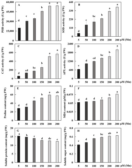 With the increase in Mn concentrations from 5 μM to 100, 150, 200, and 300 μM, the proline (Pro) content in the roots was significantly increased by 61.7, 85.6, 110.5%, and 104.5%, respectively (Figure 4E); and the CAT activity was significantly increased by 200.0, 342.7, 771.4, and 871.4%, respectively (Figure 4C). Compared with the 5 µM treatment, the 50, 100, 150, 200, and 300 µM treatments decreased the soluble protein content by 4.1, 9.1, 16.3, 18.0 and 20.0%, respectively (Figure 4G), but significantly increased the soluble sugar content by 13.3, 35.5, 42.7, 49.3, and 52.7%, respectively (Figure 4H). The malondialdehyde (MDA) content was significantly increased by 14.1, 25.6, and 45.9% with the increase in Mn concentrations from 5 μM to 150, 200, and 300 μM, respectively (Figure 4F).