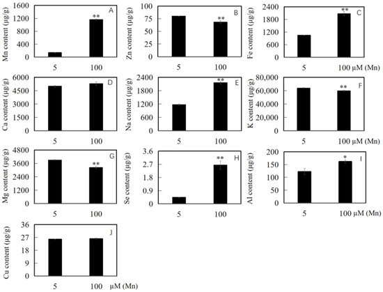 Results of various concentrations of Mn on ion accumulation in the roots of soybean. Content of (A) Mn, (B) Zn, (C) Fe, (D) Ca, (E) Na, (F) K, (G) Mg, (H) Se, (I) Al, and (J) Cu in soybean roots. The data are represented by the mean value and standard deviation (n = 4). The significance test of difference between normal group and Mn treatment group was implemented with Student’s t test at * p < 0.05 or ** p < 0.01.