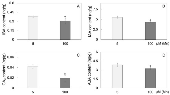 The content of hormones in the roots of soybean suffering Mn toxicity. Content of (A) indole butyric acid (IBA), (B) indoleacetic acid (IAA), (C) gibberellic acid 3 (GA3), and (D) abscisic acid (ABA) in soybean roots with 5 μM and 100 μM MnSO4 treatment. The data are represented by the mean value and standard deviation (n = 4). The significance test of difference between normal group and Mn treatment group was implemented with Student’s t test at * p < 0.05.