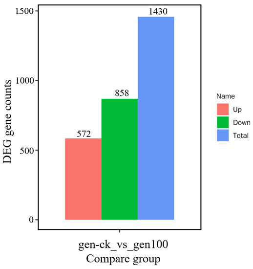The transcription levels of soybean roots treated with 5 and 100 μM Mn for 15 days were analyzed by genome-wide RNA sequencing to explore the molecular-level response of roots to Mn poisoning. Six libraries were established from the transcriptome sequencing data of soybean roots treated with the two Mn concentrations. These libraries produced about 40.8–51.5 million base reads, from which about 40.8–51.4 million clean base reads were obtained. Among them, the rate of mass value greater than 30 (Q30) basis was 92.9–94.7% (Tables S1 and S2). Finally, 45,274 genes were found in soybean roots, among which 1430 differential expression genes (DEGs) were authenticated in the roots of soybean treated with the two Mn concentrations (Figure 7 and Table S3). Among these DEGs, 572 were upregulation genes and 858 were downregulation genes (Figure 7 and Table S3).
