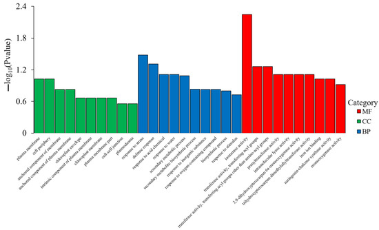 The gene ontology (GO) concentration of DEGs in soybean roots was analyzed in accordance with biological process (BP), cell composition (CC), and molecular function (MF). For each GO classification, the most remarkable enrichment was surveyed and presented, as shown in Figure 8 and Table S4. The results indicated that the DEGs in soybean root were mainly concentrated on MF, followed by BP and CC.