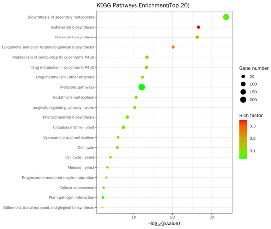 The Kyoto Encyclopedia of Genes and Genomes (KEGG) enrichment site map of DEGs was a visual exhibition of KEGG enrichment analysis results (Figure 9 and Table S5). In this study, the top 20 pathways with marked enrichment were chosen to be exhibited. If less than 20 pathway entries were enriched, all pathway entries were displayed. The KEGG enrichment was evaluated by Rich factor (RF), FDR, and the quantity of genes gathered in this passageway. RF means the percentage between the amount of DEGs situated in the passageway entry and the total quantity of genes situated in the passageway entry among all of the interpreted genes. The higher the RF is, the higher the gathering level. In general, the value scope of FDR is 0–1, and the more it approaches zero, the more remarkable the enrichment is. In soybean roots, enrichment was mainly manifested in the biosynthesis of secondary metabolites (194 genes, containing 44 upregulation and 150 downregulation genes), isoflavone biological synthesis (31 genes, containing 2 upregulation and 29 downregulation genes), and flavonoid biological synthesis. Furthermore, enrichment was mainly manifested in ubiquinone and other terpenoid–quinone biosynthesis (30 genes, including 1 upregulated and 29 downregulated); cytochrome P450 metabolizes allobiotin (36 genes, containing 2 upregulation and 34 downregulation genes); drug metabolism—cytochrome P450 (35 genes, containing 1 upregulated and 34 downregulated genes); drug metabolism—other enzymes (35 genes, containing 2 upregulation and 33 downregulation genes); metabolic pathway (236 genes, containing 60 upregulation and 176 downregulation genes); glutathione metabolism (35 genes, including 2 upregulated and 33 downregulated genes); biosynthesis of phenylpropanes (36 genes, containing 10 upregulation and 26 downregulation genes); and circadian rhythm—plants (35 genes in total, including 1 upregulated and 34 downregulated genes).