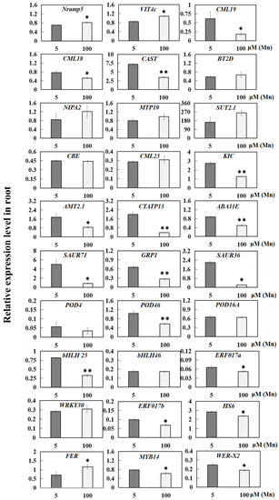 qRT-PCR results of 30 DEGs in the roots of soybean at 5 and 100 µM Mn concentrations. The relative expression level of DEGs in the roots of soybean. The data are represented by the mean value and standard deviation (n = 4). The significance test of difference between normal group and Mn treatment group was implemented with Student’s t test at * p < 0.05 or ** p < 0.01. Nramp5: metal transporter; VIT4c: vacuolar iron transporter homolog 4; CBE, CML, CAST, and KIC: calcium-binding proteins; BT2D: boron transporter; NIPA2: magnesium transporter; MTP10: metal tolerance protein 10; SUT2.1: sulfate transporter 2.1; AMT2.1: ammonium transporter; CTATP13: calcium-transporting ATPase 13; ABA11E: ABA synthesis-related protein; SAUR: auxin reactive protein; GRP: gibberellin-responsive protein; POD: peroxidase; bHLH: bHLH transcription factor; ERF: ethylene response transcription factor; WRKY30: WRKY transcription factor; HS6: heat stress transcription factor; FER: FER transcription factor; MYB14: MYB transcription factor; WER-X2: WER transcription factor.