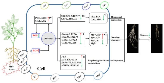 Differing from the change rule of Mn accumulation content in plants, the content of Mg in soybean roots decreased with the increase in concentration of Mn (Figure 5), indicating that the absorption of Mn and Mg may be antagonistic. Results have displayed that Mn poisoning can inhibit root absorption of Mg in Sorghum bicolor, Solanum lycopersicum, S. guianensis, and other vegetation, causing a noticeable reduction in the concentration of Mg in plants [50]. In this research, Mn poisoning observably decreased the concentration of Mg in roots (Figure 5), suggesting that Mn poisoning mainly hindered the accumulation of Mg by the roots of soybean. Reducing the Mg content in roots may have an important effect in alleviating Mn toxicity and maintaining root function normally, and it may be one of the soybean adaptation processes to Mn poisoning. Studies have shown that excessive Mn in plants can affect the absorption of other important metal nutrients [51,52]. Present studies indicated that the exposure of roots to Mn poisoning seriously affected ion accumulation in the roots of soybean. The molecular regulation mechanism involved is very complex, and it may involve many different types of proteins or genes.