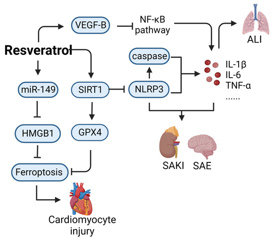 - Li, J.; Zeng, X.; Yang, F.; Wang, L.; Luo, X.; Liu, R.; Zeng, F.; Lu, S.; Huang, X.; Lei, Y.; et al. Resveratrol: Potential Application in Sepsis. Front. Pharmacol. 2022, 13, 821358. [Google Scholar] [CrossRef]