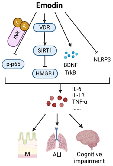 - Liu, F.J.; Gu, T.J.; Wei, D.Y. Emodin Alleviates Sepsis-Mediated Lung Injury via Inhibition and Reduction of NF-kB and HMGB1 Pathways Mediated by SIRT1. Kaohsiung J. Med. Sci. 2022, 38, 253–260. [Google Scholar] [CrossRef] [PubMed]