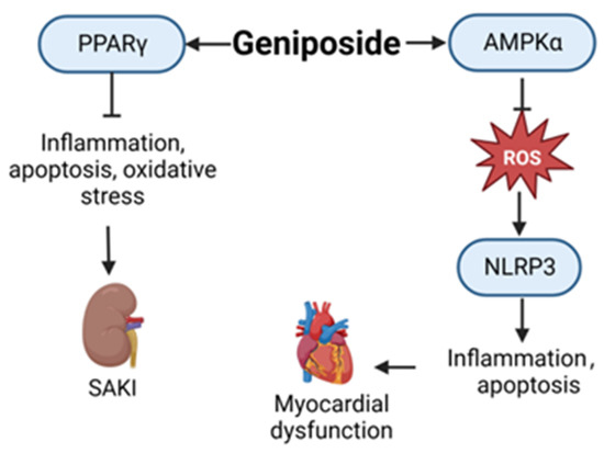 - Liu, J.; Zhao, N.; Shi, G.; Wang, H. Geniposide Ameliorated Sepsis-Induced Acute Kidney Injury by Activating PPARγ. Aging 2020, 12, 22744–22758. [Google Scholar] [CrossRef]