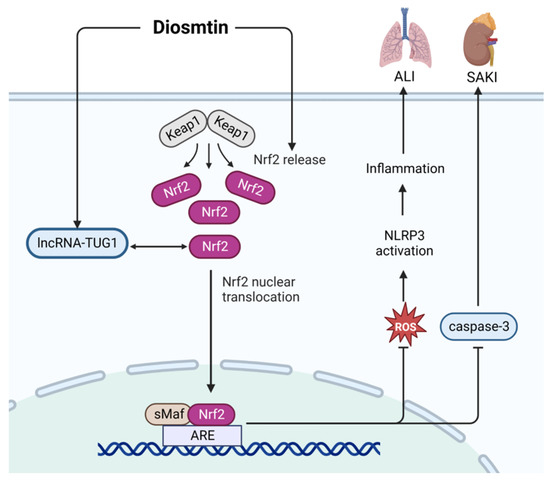- Wang, W.; Zhang, S.; Yang, F.; Xie, J.; Chen, J.; Li, Z. Diosmetin Alleviates Acute Kidney Injury by Promoting the TUG1/Nrf2/HO-1 Pathway in Sepsis Rats. Int. Immunopharmacol. 2020, 88, 106965. [Google Scholar] [CrossRef]