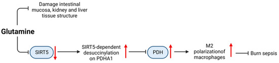 - Zhu, Y.; Chen, X.; Lu, Y.; Xia, L.; Fan, S.; Huang, Q.; Liu, X.; Peng, X. Glutamine Mitigates Murine Burn Sepsis by Supporting Macrophage M2 Polarization Through Repressing the SIRT5-Mediated Desuccinylation of Pyruvate Dehydrogenase. Burns Trauma 2022, 10, tkac041. [Google Scholar] [CrossRef]