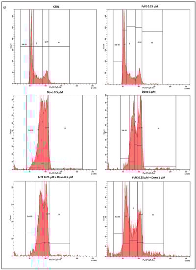 No differences in cell cycle progression were observed in H9c2 cells exposed to FcFE 0.25 μM with respect to untreated cells (CTRL) (Figure 7a,b). The S phase reduction induced by Doxo 0.5 μM and Doxo 1 μM treatment showed significant dose-dependence (Figure 7a,b). Flow cytometry analysis showed that H9c2 cells treated with Doxo 1 μM were highly accumulated in the G2-M phase with a concomitant decrease in the number of cells in the G0-G1 and S phases of the cell cycle (Figure 7a,b). In the cells incubated with Doxo 1 μM, pre-treatment with FcFE 0.25 μM led to a significant recovery of G2-M and the S phase of the cell cycle (Figure 7a,b).