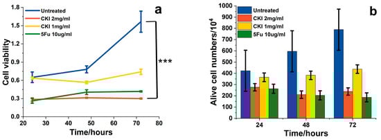 CKI inhibited proliferation and cell viability. (a) Inhibition of BGC823 cell viability via CKI. The viability was measured using a CCK8 kit (MTT). (b) Live cell counts using trypan blue staining in different drug-treated conditions. Data are represented as mean ± SD. Two-way ANOVA *** p < 0.01.