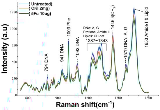 The nucleus, which contains most of the cell’s DNA and is responsible for RNA (mRNA, tRNA, rRNA) synthesis, is the primary target of anticancer drugs. Previous studies have shown that 5Fu exerts its anticancer effects by inhibiting thymidylate synthase and incorporating its metabolites into RNA and DNA, thereby disrupting normal DNA and RNA processing and function, as thymidylate is required for DNA replication and repair [23]. CKI can increase the level of DNA double-strand breaks (DSBs) and inhibit DNA repair and replication [24,25,26]. We used nuclear RS to validate the drug’s effects on nucleic acid components, as shown in Figure 2. The difference in the RS between the CKI- and 5Fu-treated cells was shown by the RS peaks corresponding to nucleic acids and other cell components. In eukaryotic cells, the RS bands at 794, 941, 1092, and 1579 cm−1 correspond to nucleic acid components [27]. The characteristic peaks are assigned in Table S1 with reference to previous studies on different cell lines and biomolecules [27,28,29,30,31,32]. Figure 2 shows that the Raman spectral profile of the treated groups was decreased after 24 h, mainly reflected in the Raman bands assigned to nucleic acid: 794 cm−1 (DNA), 941 cm−1 (RNA), 1092 cm−1 (DNA), 1375 cm−1 (A, G, T), and 1579 cm−1 (DNA). The changes at 48 h, shown in Figure S1, were similar to those at 24 h. The decrease in DNA and RNA components in the nucleus confirmed the effects of CKI and 5Fu on cellular DNA and RNA.
