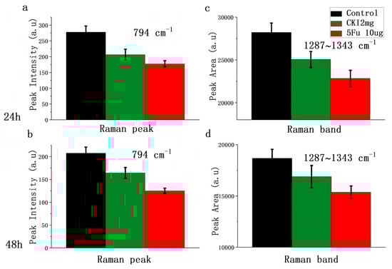 Bar plot of RS at 794 cm−1 and area under spectra between 1297 cm−1 and 1343 cm−1 (a,b). The RS intensity of different groups at 794 cm−1 (control black, CKI 2 mg green, 5Fu 10μg red) at 24 h and 48 h. (c,d). The area under spectra from 1297 cm−1 to 1343 cm−1 for different groups at 24 h and 48 h. Mean ± SD (the three groups were compared via one-way ANOVA, and p < 0.05 in each figure).