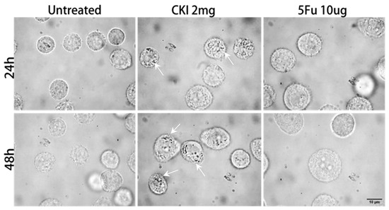 Compared with the untreated group, there was no significant change in cell size in the CKI-treated group, but this group presented many intracellular vesicles (shown as arrows), while the cell size was significantly increased in the 5Fu-treated group. This means that the mechanisms of action of CKI and 5Fu are different.