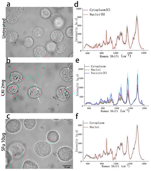 To further investigate the effect of CKI on the cells, we compared the RS results of the cytoplasm and the nucleus of the same cell. For the untreated cell group, the RS signals appeared to be same (Figure 5d). It was only in the CKI-treated group that the RS signals of the cytoplasm were significantly lower than those of the nucleus (Figure 5e). Meanwhile, RS showed that the IVs had strong signals exactly at the peaks where the cytoplasm decreased. The results at 24 h were the same as those at 48 h. This indicated that some components moved from the cytoplasm into the vesicles within the CKI-treated cells. This was consistent with the degradation of cellular components that occurs during apoptosis and autophagy.