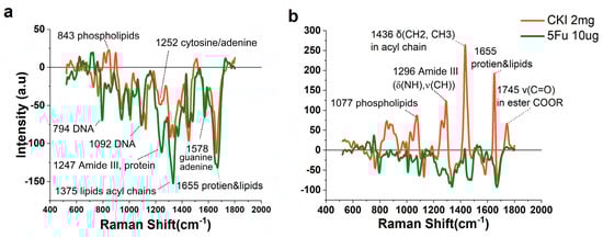 The RS of the cytoplasm of GBC−823 cells treated with CKI and 5Fu. (a) The RS of the cytoplasm from drug-treated cells, subtracting the RS of the cytoplasm from untreated cells at 24 h. (b) The RS of the cytoplasm from drug-treated cells, subtracting the RS of the cytoplasm from untreated cells at 48 h.