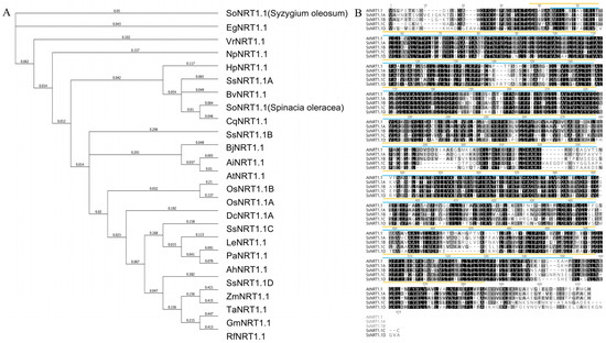 Different homologous NRT genes were identified from plant species based on the NCBI protein database. Protein sequences of SsNRT1.1s from S. salsa and from other NRT proteins were analyzed for their phylogenetic relationship using ClustalW multiple sequence alignment. The four SsNRT1.1 proteins are located in different branches and have a distant evolutionary relationship with the model plants rice (Oryza sativa L.) and Arabidopsis. Among these four SsNRT1.1 proteins, SsNRT1.1A and SsNRT1.1B are relatively closely related evolutionarily, while SsNRT1.1C and SsNRT1.1D are also relatively closely related evolutionarily (Figure 1A). A structural analysis of the different SsNRT1.1 proteins showed that they harbored similar functional domains, which are the major facilitator superfamily (MFS) and peptide transport 2 superfamily (PTR2) (Figure 1B).