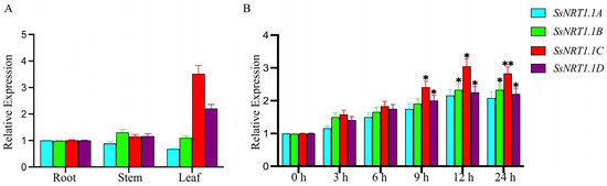 To explore the involvement of the SsNRT1.1 genes in response to salt stress, six-week-old leaves of S. salsa were cultivated and used as the experimental model. A concentration of 400 mM NaCl was chosen as the salt stress treatment. The RNA was extracted from the leaves at the time points 0 h, 3 h, 6 h, 9 h, 12 h and 24 h. The levels of expression of the four SsNRT1.1 genes in S. salsa gradually increased over time following treatment with 400 mM NaCl (Figure 2B). Among them, the SsNRT1.1C gene showed the largest change and the level of expression of SsNRT1.1C increased the most by 3.05-fold at 12 h. However, after 24 h of salt stress, the levels of expression of all four SsNRT1.1 genes began to decrease.