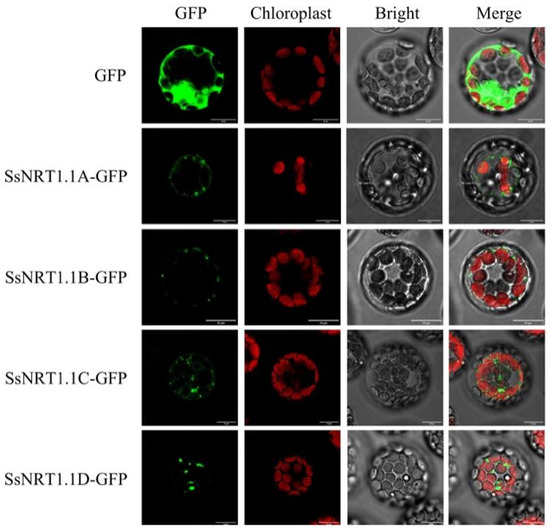 We constructed the C-terminal green fluorescent protein (GFP) fusion vector SsNRT1.1s-GFP to reveal the location of these genes in cells. GFP was used as the control and observed separately. The proteins of these four genes were found to be primarily distributed in the endoplasmic reticulum (ER) (Figure 3). This is different from previous research that found that AtNRT1.1 is primarily localized to the cell membrane, while OsNRT1.1A and OsNRT1.1B are primarily localized to the vacuolar membrane and cell membrane [31,32]. The same genes of different species are located in different organelles which strongly suggests that their functions are also different. The primary functions of the ER include protein synthesis, processing, energy metabolism, calcium ion storage and the regulation of redox signals in eukaryotic cells. Therefore, we hypothesize that the SsNRT1.1 genes of S. salsa may be involved in protein synthesis, processing and energy metabolism in cells.