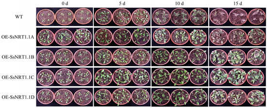 No significant changes in the WT and transgenic Arabidopsis were observed at 5 d. However, some leaves of the WT began to turn white at 10 d, while there was no significant change in the transgenic Arabidopsis. At 15 d, the WT had mostly turned white and could not grow normally, but the transgenic plants grew normally and had varying degrees of whitening on their leaves. In these transgenic lines, 35S:: SsNRT1.1C Arabidopsis had the most salt-tolerant phenotype.