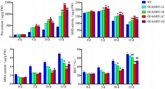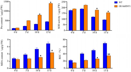 Figure 12. SsHINT1 transgenic Arabidopsis physiological detection under salt stress. Pro, SOD, MDA and REC were chosen as a physiological detection index in Arabidopsis salt stress. Pro content was increased during salt treatment and OE-SsHINT1 had the highest. MDA and REC were increased during salt treatment and WT had the highest. SOD activity increased at 5 d after salt treatment and then decreased and the WT had a greater decline. Data are presented as means (±SD) of three biological replicates. Asterisks above the data bars indicates a significant difference (two-tailed t-test * p < 0.05 ** p < 0.01) or no significant difference, respectively.