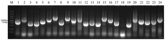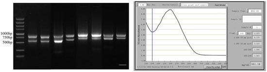 We selected different concentrations and tissues with the highest levels of expression to construct a salt-stressed yeast cDNA library of S. salsa and identified the quality of the library. The final confirmed storage capacity of the yeast library was 8.76 × 10⁷ CFU·mL−1 with a total clone count of 1.752 × 10⁸ CFU. The rate of recombination was 95.8% (Figure 6).