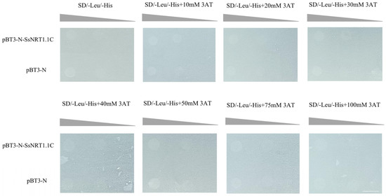 We verified the self-activating ability of the constructed pBT3-N-SsNRT1.1C vector. No self-activation phenomenon was found on the SD/-Leu/-His block. Moreover, no expression of the HIS3 gene was observed (Figure 7).