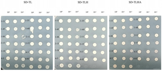 Positive monoclonal clones that had been grown on SD-TLH-deficient plates were diluted with sterile water at concentrations of 100, 10−1 and 10−2 and then incubated on plates deficient in SD-TL, SD-TLH and SD-TLHA at 30 °C for 3–4 days. As previously described, the positive control was selected as pBT3-STE-OsPT2 + pPR3-N-OsPP95, and the negative control was pBT3-STE-OsPT2 + pPR3-N-OsPP95CT [33]. The rotation validation results showed that all 12 monoclonal transformants grew monoclonal clones in the rotation experiment (Figure 9). Therefore, this experiment provides preliminary evidence that these 12 proteins may have an interactive relationship with SsNRT1.1C.