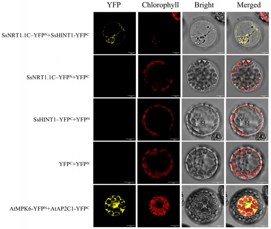 Owing to the possibility of false positives, we constructed bimolecular fluorescence complementation (BiFC) vectors for these 12 genes and conducted BiFC experiments with SsNRT1.1C, ultimately confirming the protein interaction relationship between SsHINT1 and SsNRT1.1C (Figure 10).