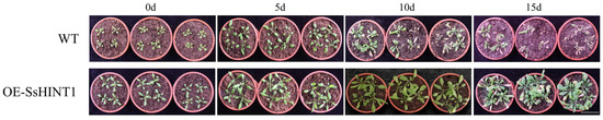 There were no significant changes in the phenotypes of WT and SsHINT1 transgenic Arabidopsis after 5 d under 250 mM NaCl salt stress. However, one-third of the leaves of WT began to turn white after 10 d of salt treatment and transgenic plants only had a few leaf edges turn white. This indicates that salt stress damaged the WT but had not yet impacted the transgenic plants. More than half of the WT could not continue growing after 15 d and most of the surviving Arabidopsis leaves turned white. However, transgenic Arabidopsis had only a few white leaves (Figure 11).
