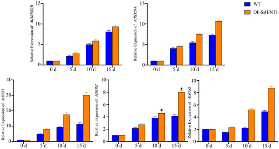 Figure 13. Expression of related genes under salt stress in Arabidopsis. AtDREB2B, AtRD29A, AtSOS1, AtSOS2, AtSOS3 were selected for qRT-PCR, which are salt tolerance genes. The expression of these genes began to rise with time and OE-SsHINT1’s expression was higher than in the WT. In particular, AtSOS1/2/3 expression was higher than in the WT. Data are presented as means (±SD) of three biological replicates. Asterisks above the data bars indicates a significant difference (two-tailed t-test * p < 0.05) or no significant difference, respectively.
