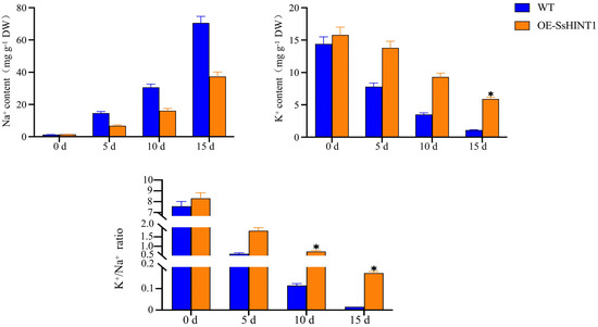 Figure 14. Na+ and K+ contents in SsHINT1 transgenic Arabidopsis. Days 0, 5, 10, 15 were chosen to detect the Na+ and K+ content. The Na+ content was increased and K+ content was decreased. The K+/Na+ ratio was decreased, but OE-SsHINT1’s ratio was higher than in WT, which became more evident over time. Data are presented as means (±SD) of three biological replicates. Asterisks above the data bars indicates a significant difference (two-tailed t-test * p < 0.05) or no significant difference, respectively.