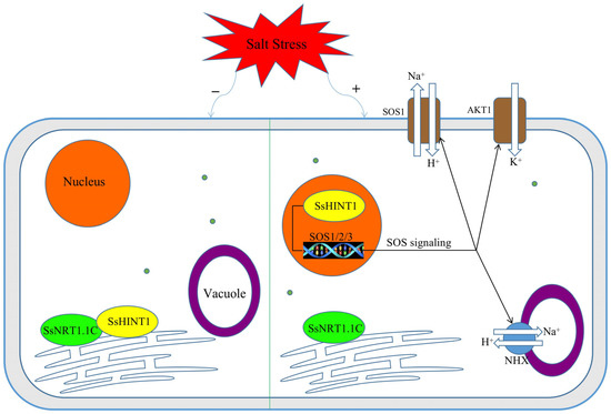 Therefore, we hypothesized that SsNRT1.1C enhances the plant salt tolerance pathway. Under normal conditions, SsNRT1.1C and SsHINT1 proteins interact in the ER. When the plant cells are stimulated by salt stress, SsHINT1 leaves the ER and activates the SOS1/2/3 signaling pathway by entering the nucleus. After the SOS signaling pathway is activated, it enhances plant salt tolerance by increasing the K+/Na+ ratio (Figure 15).